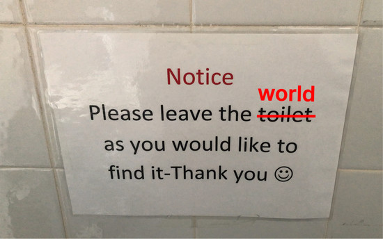I’m reminded here of a sign you might see in common public spaces, like that of a bathroom or changing room. One that might advise us: Leave this place better than you found it.